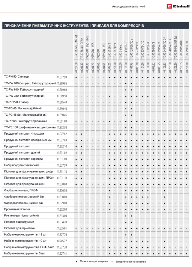 Завдяки цьому дуже мобільному і компактному компресору Einhell TC-AC 190/6/8 OF ви можете виконувати безліч простих робіт, що вимагають стисненого повітря, в домашніх умовах, в саду і гаражі або в кемпінгу. Завдяки наявності ресивера зі стисненим повітрям з 6 літрів, невеликі роботи можуть бути виконані без нового запуску двигуна компресора. Оскільки повітряний компресор працює без змащення мастилом, пристрій не містить мастила і не вимагає обслуговування. Таким чином, компресор можна зручно транспортувати в будь-якому положенні. Тиск компресора TC-AC 190/6/8 OF можна регулювати для різних завдань від 0 до 8 бар за допомогою регулятора тиску. Робочий тиск регулюється на редукторі тиску і відображається на манометрі. Завдяки запобіжному клапану оператор оптимально захищений. Ергономічна конструкція забезпечує зручність під час роботи і зручність при транспортуванні. Ніжка виконана у вигляді присоски для безпечної роботи, а зручне намотування кабелю піклується про швидку впорядкованість після завершення роботи. Ресивер має 10-річну гарантію від корозії.